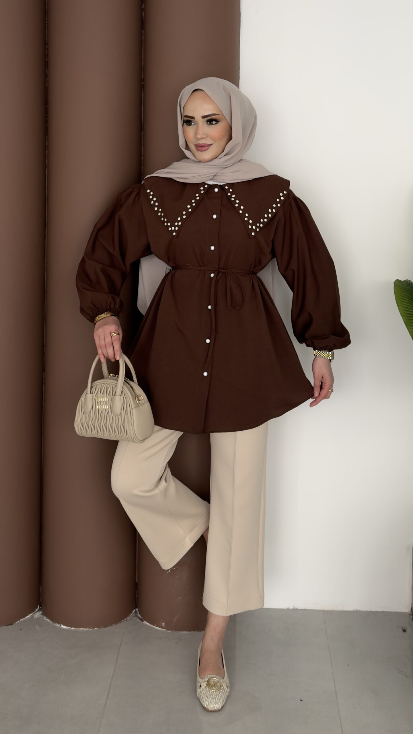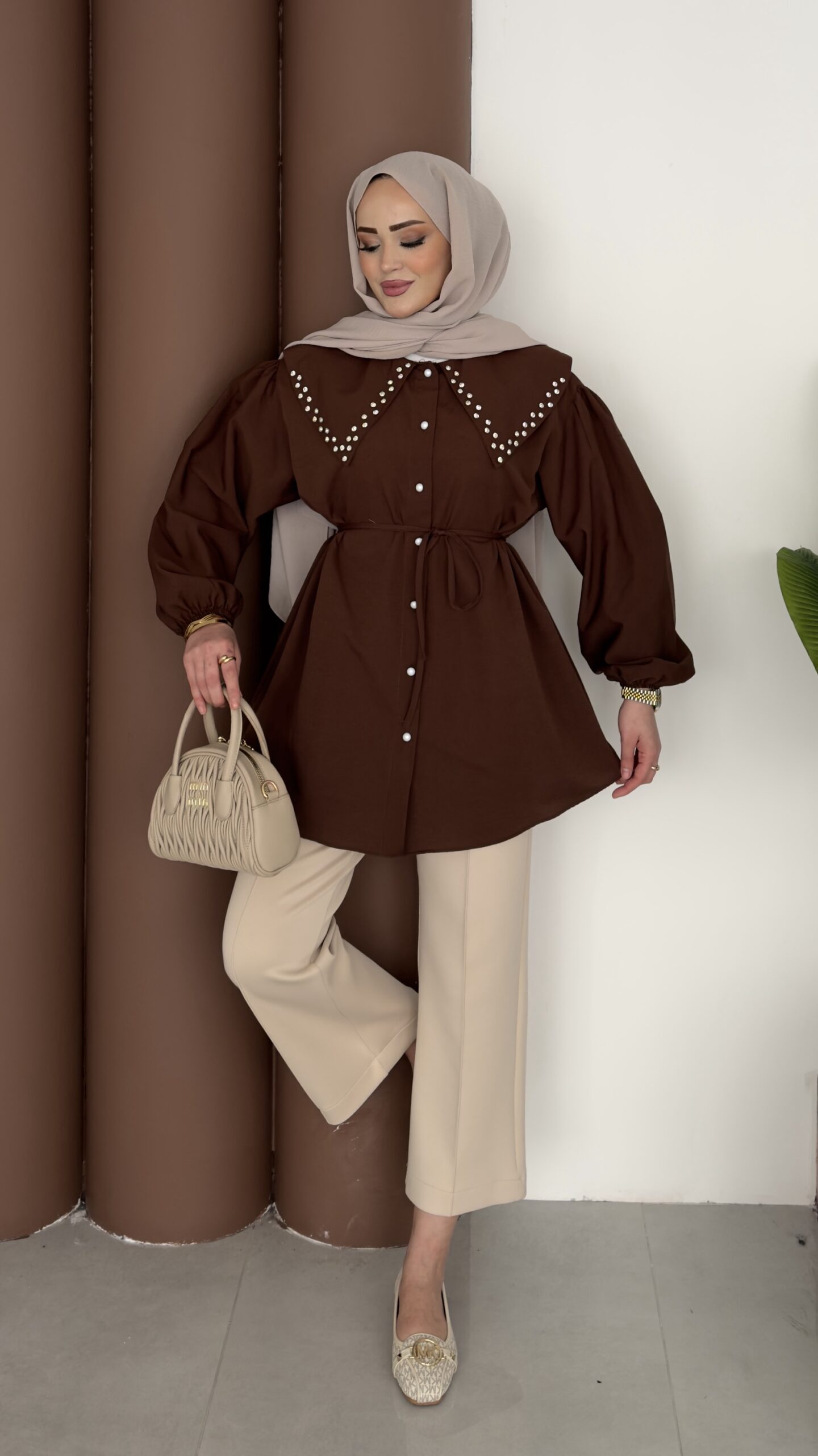 Diva Yakası Taşlı Gömlek – Kahverengi