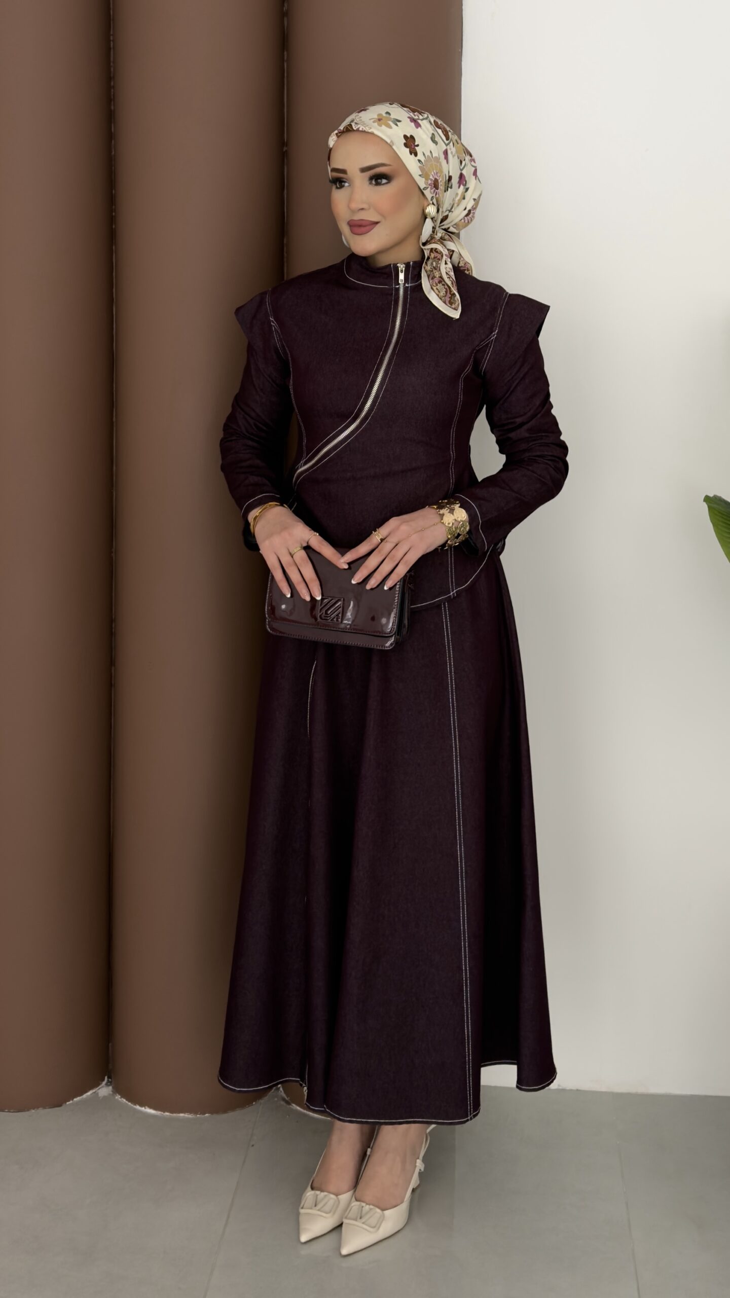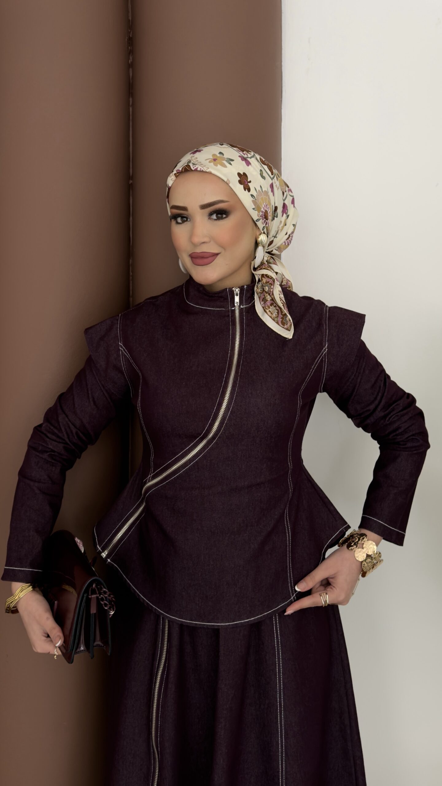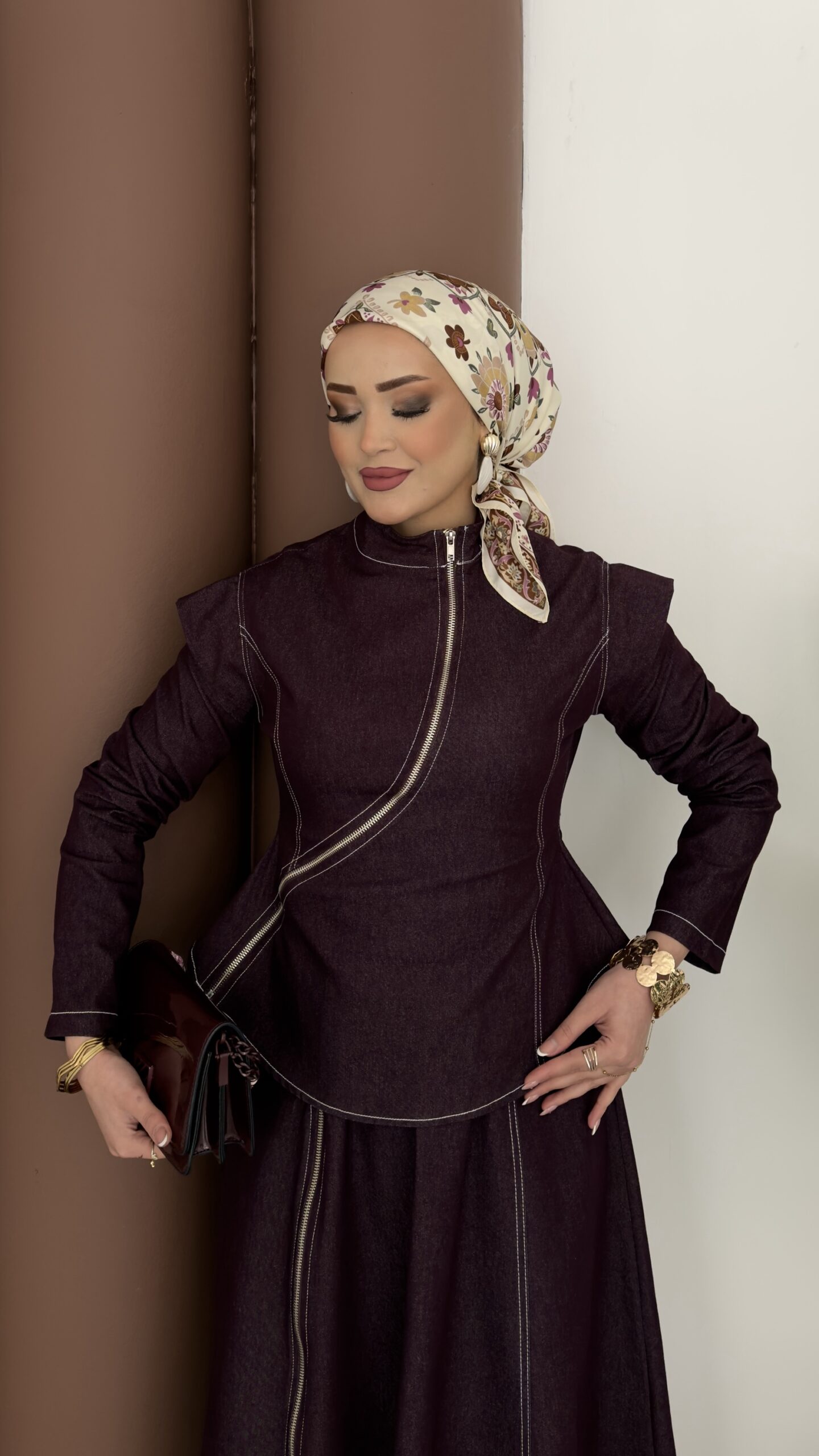 Ghalia Fermuarlı Kot Etekli Takım – Mürdüm