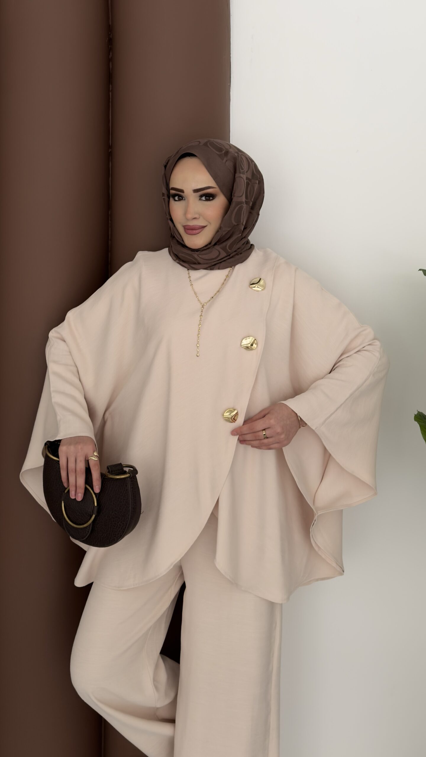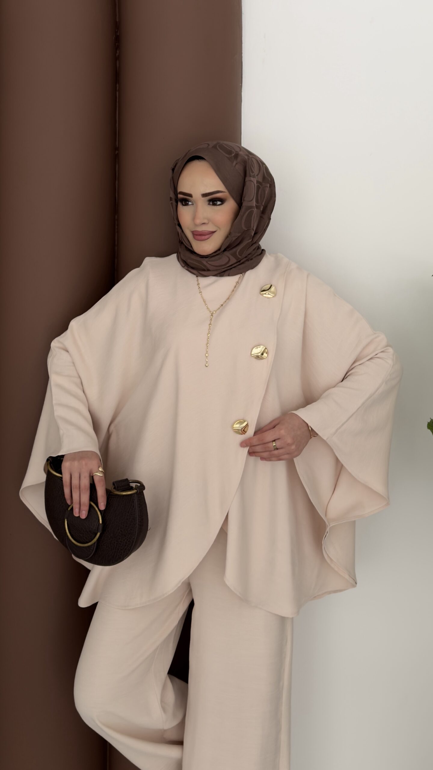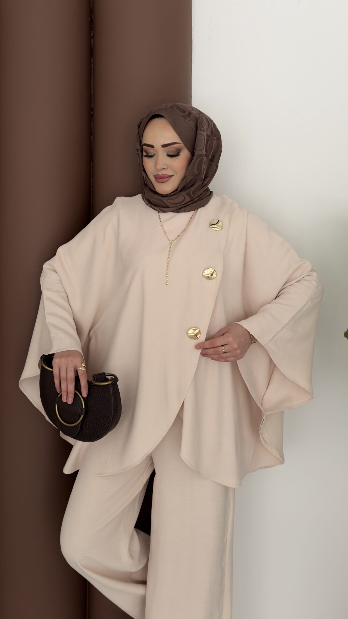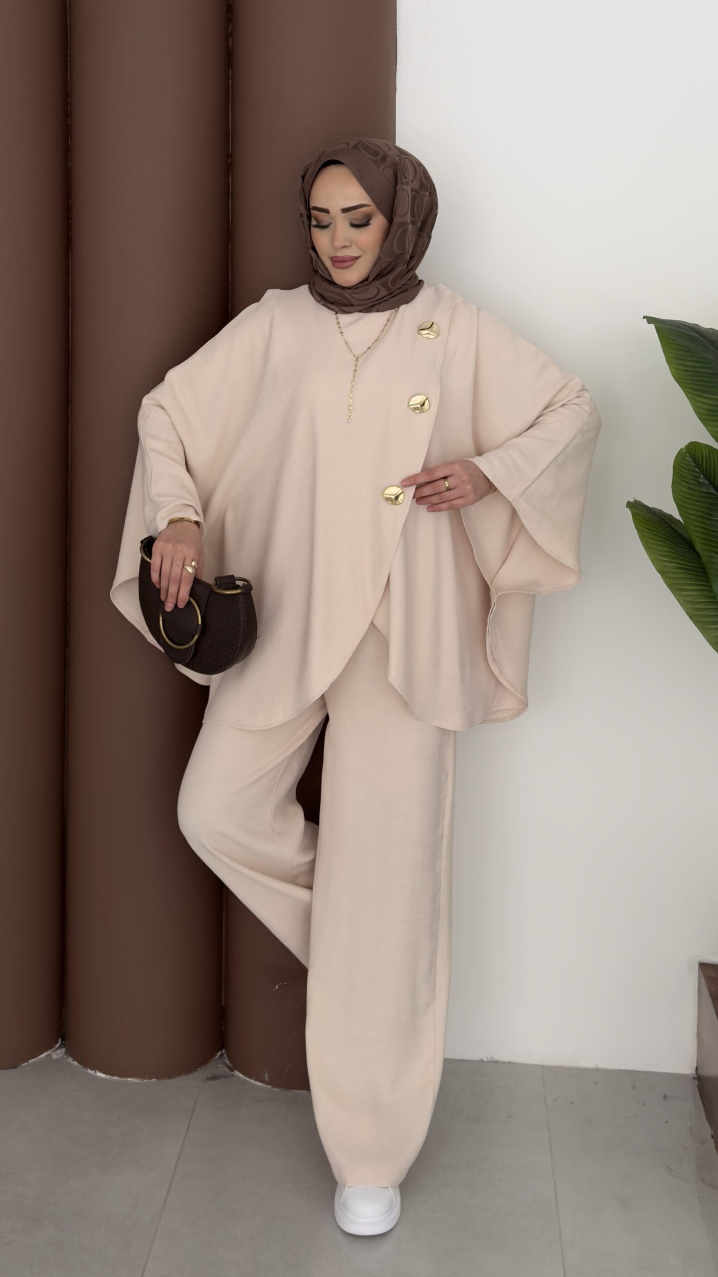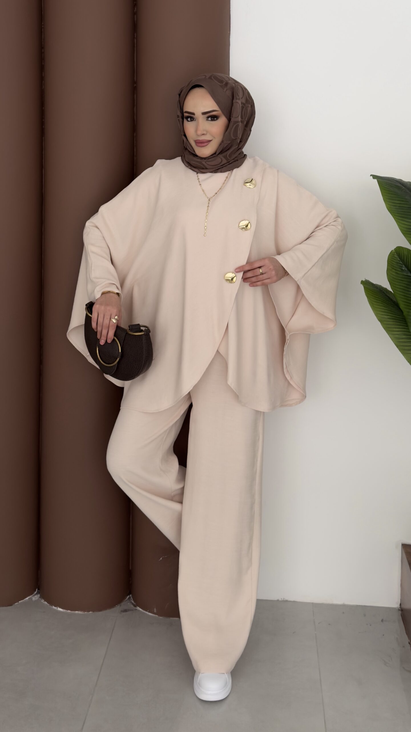 Gold Düğmeli Panço İkili Takım – Bej