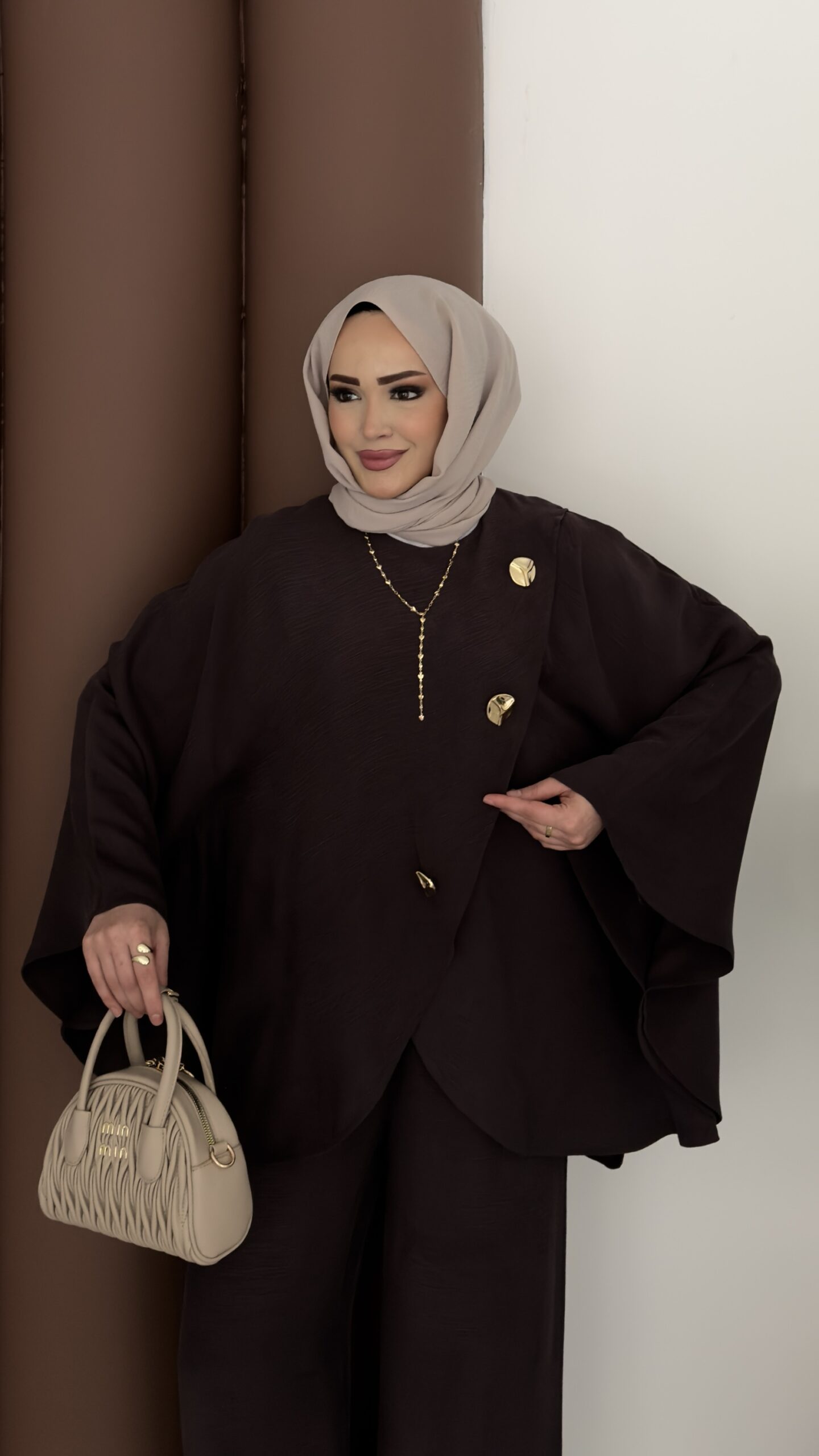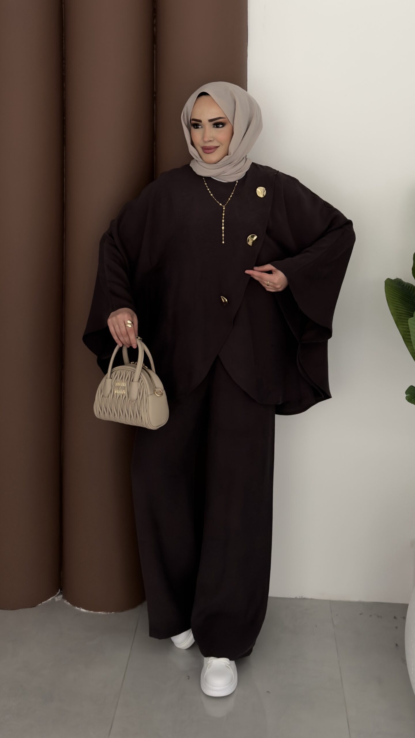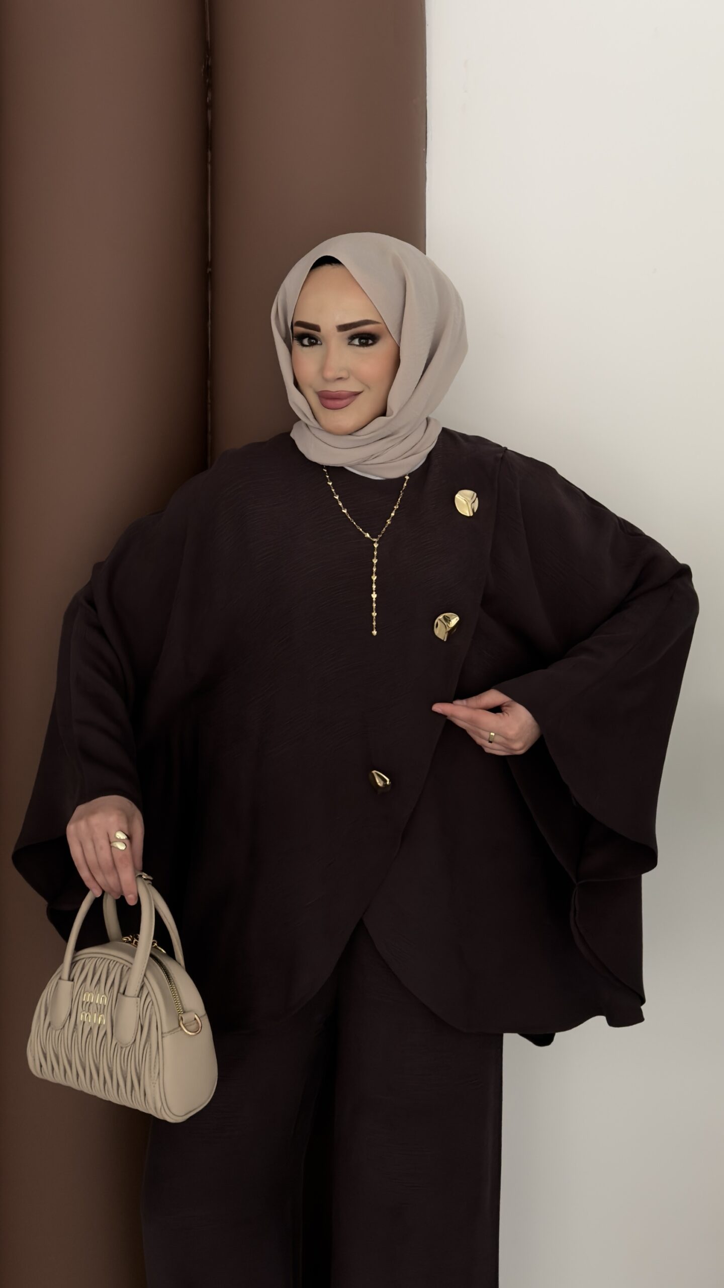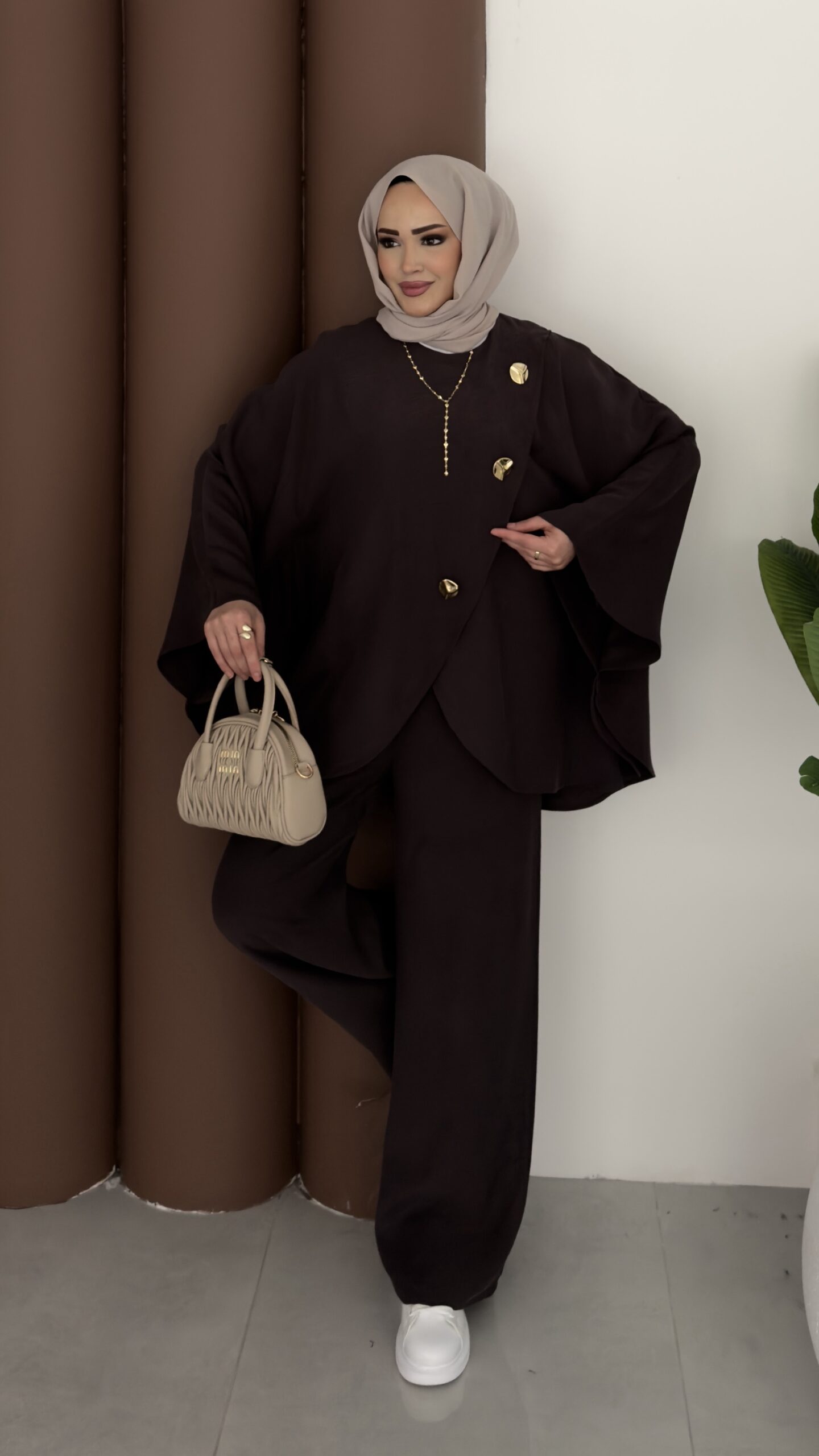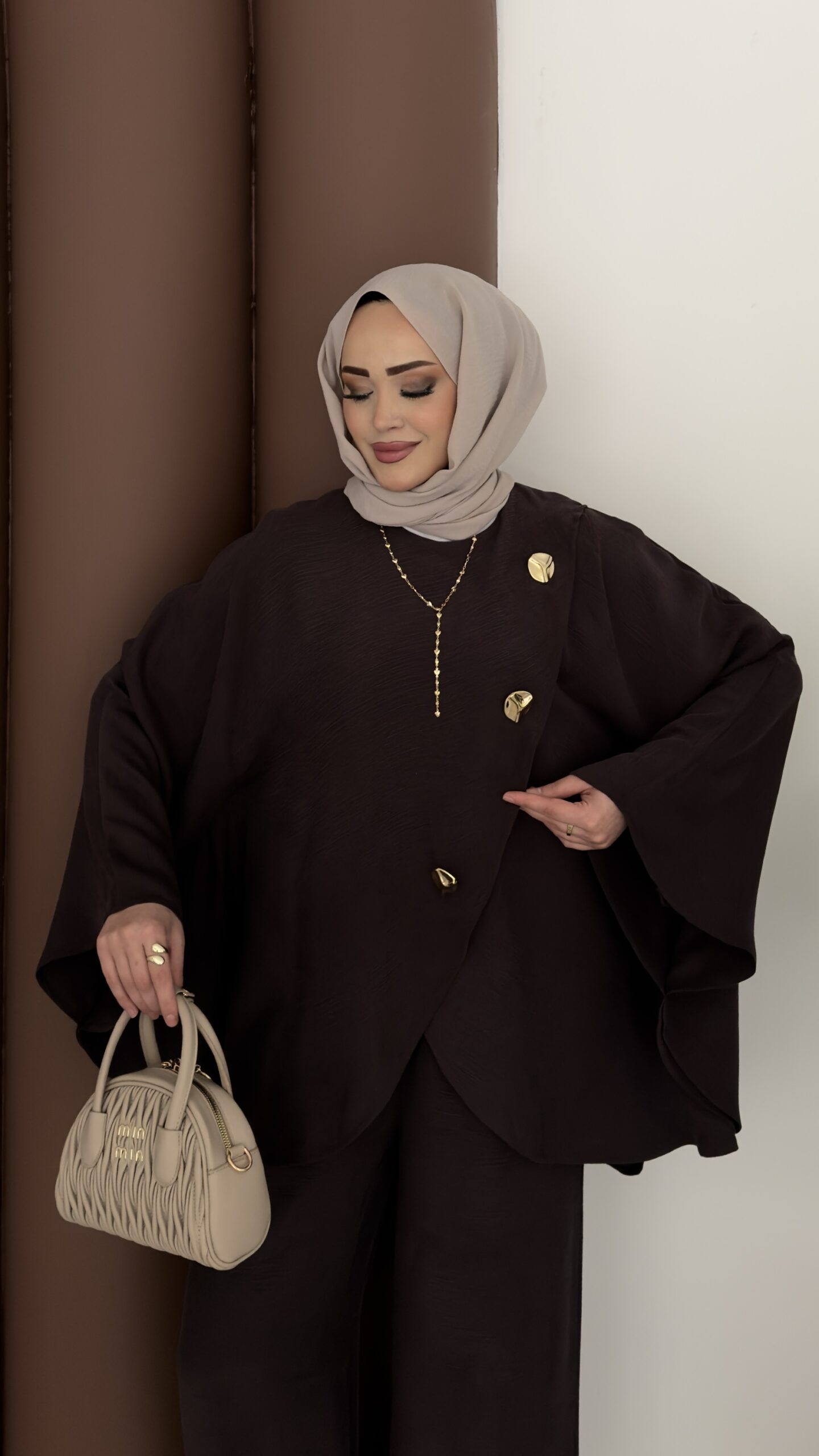 Gold Düğmeli Panço İkili Takım – Kahverengi
