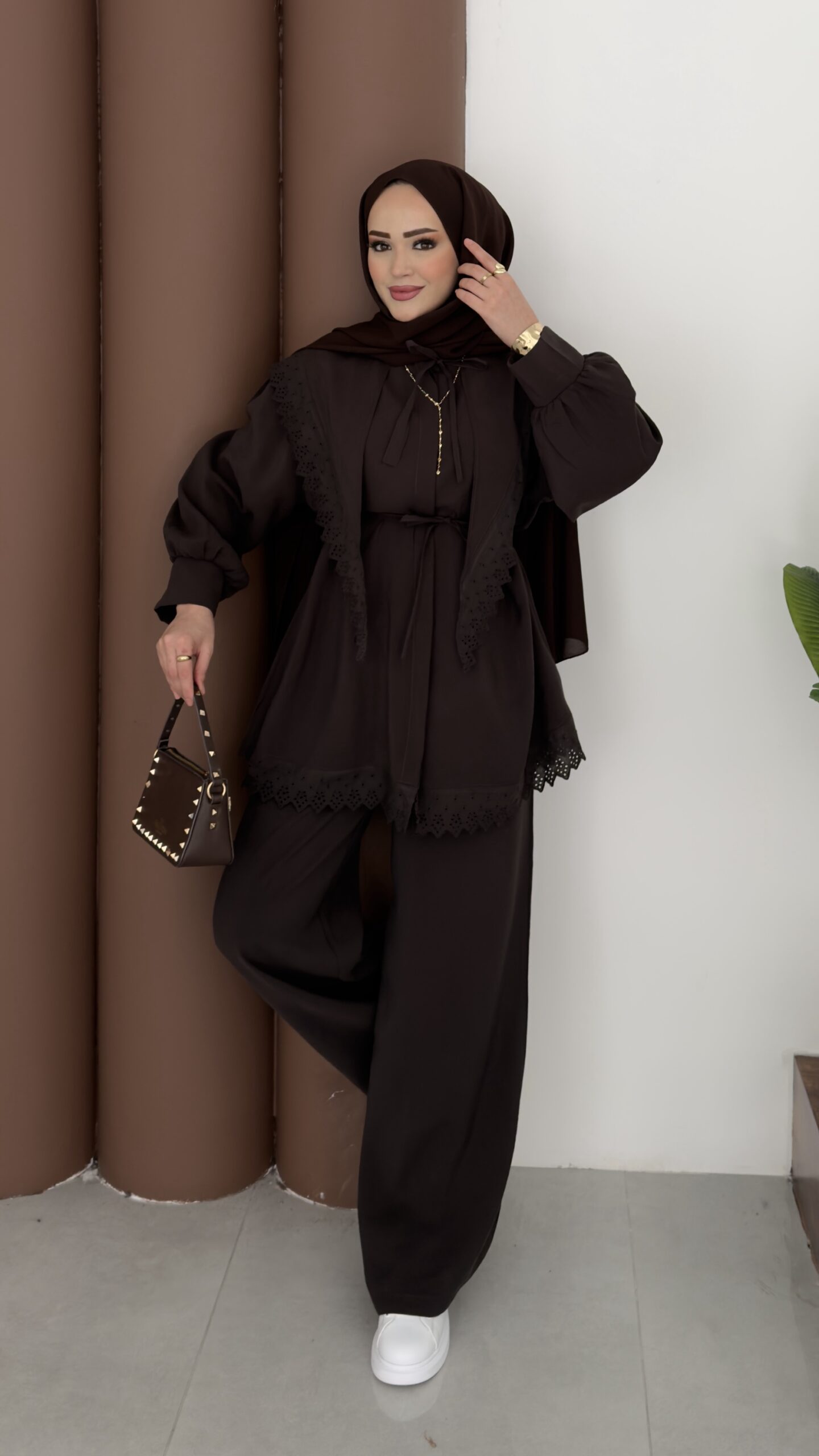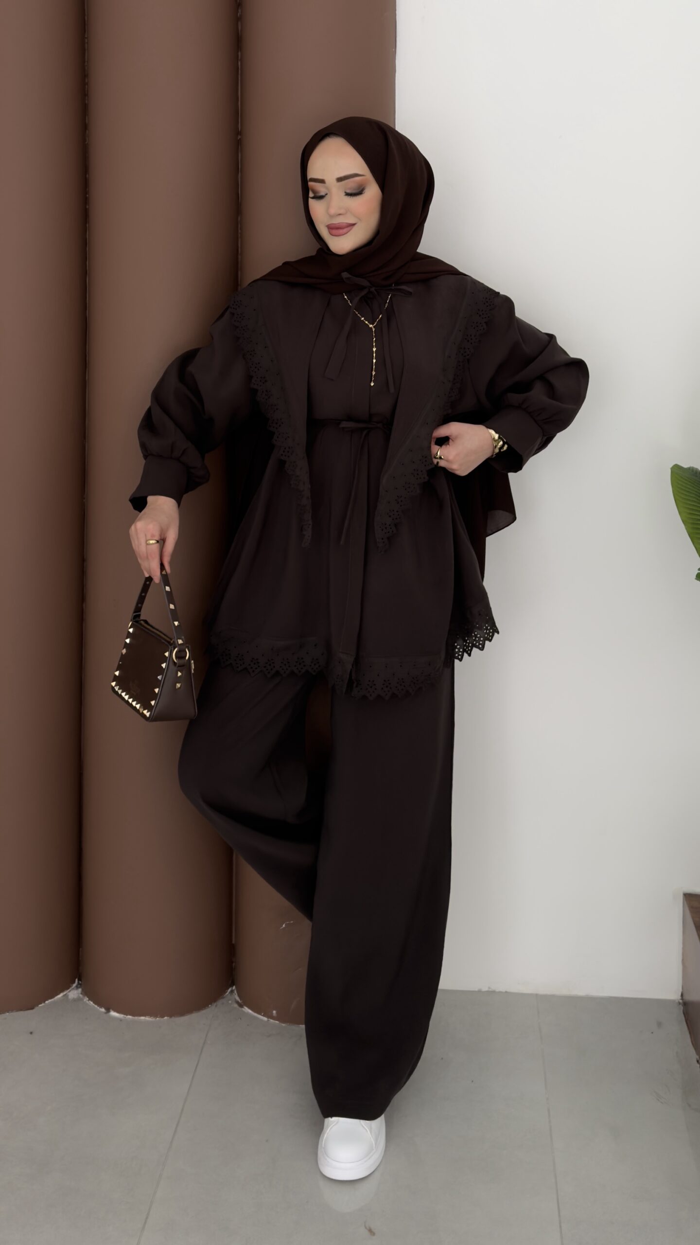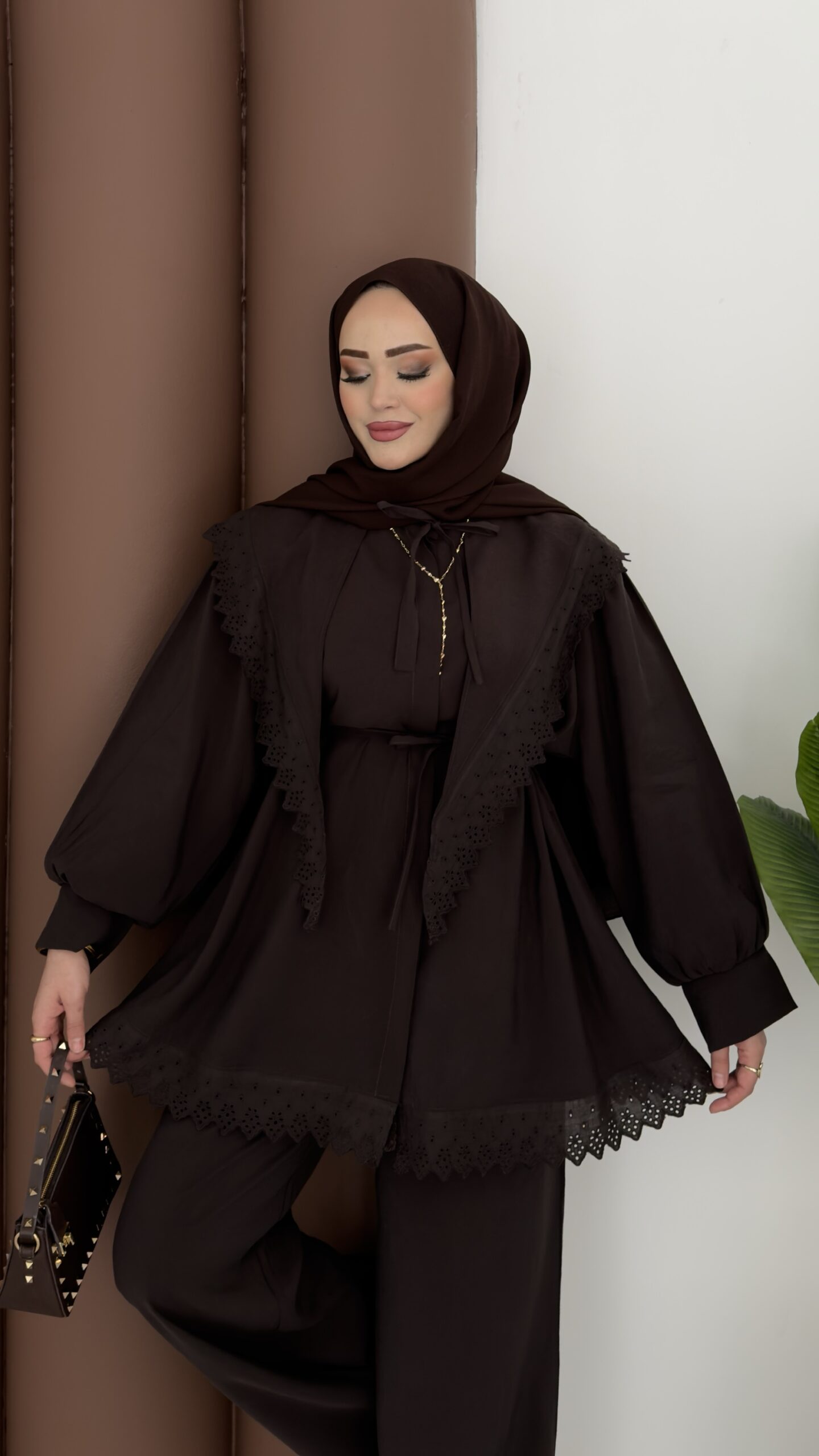 Güpür Yakalı Modal İkili Takım – Kahverengi