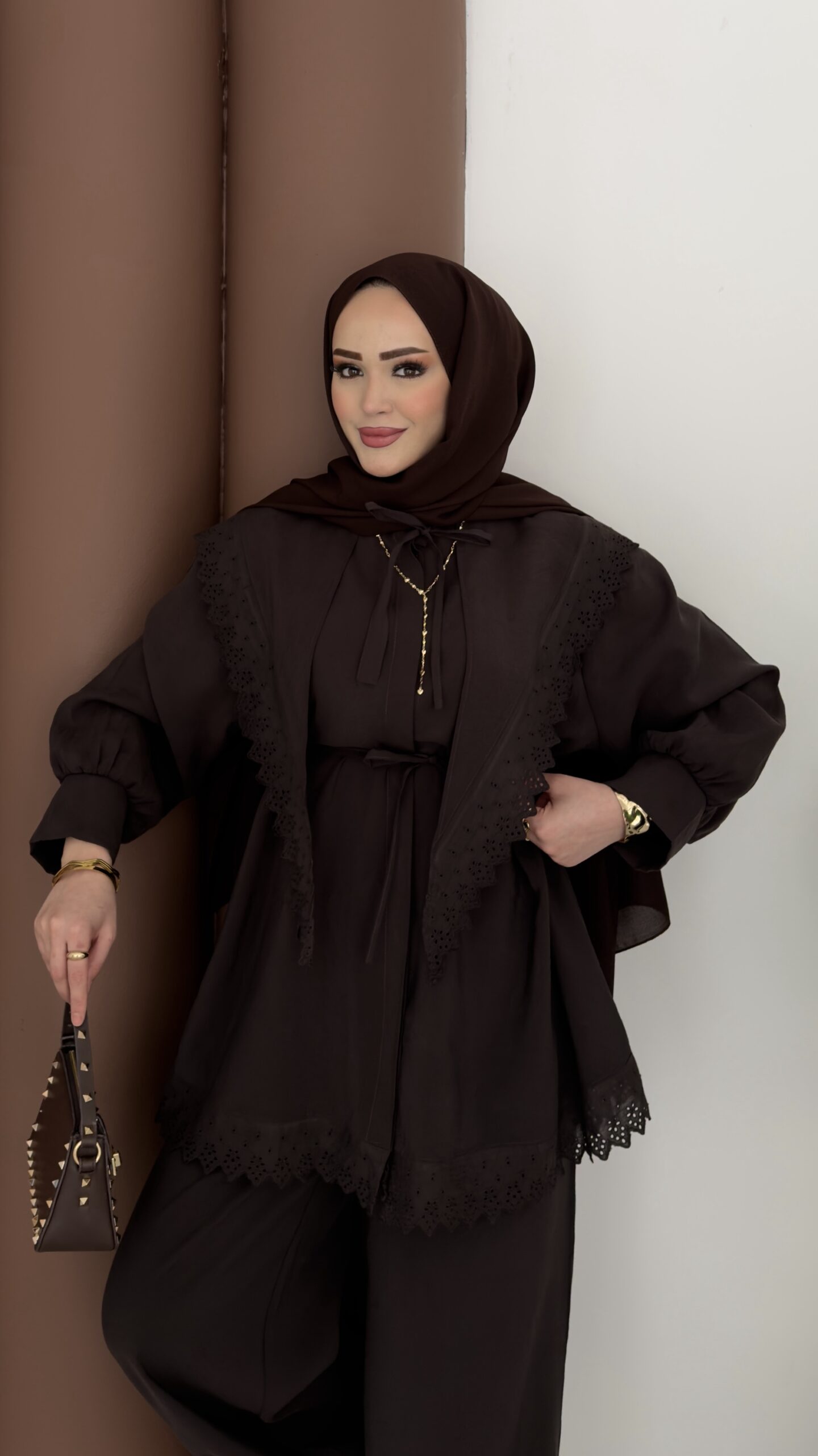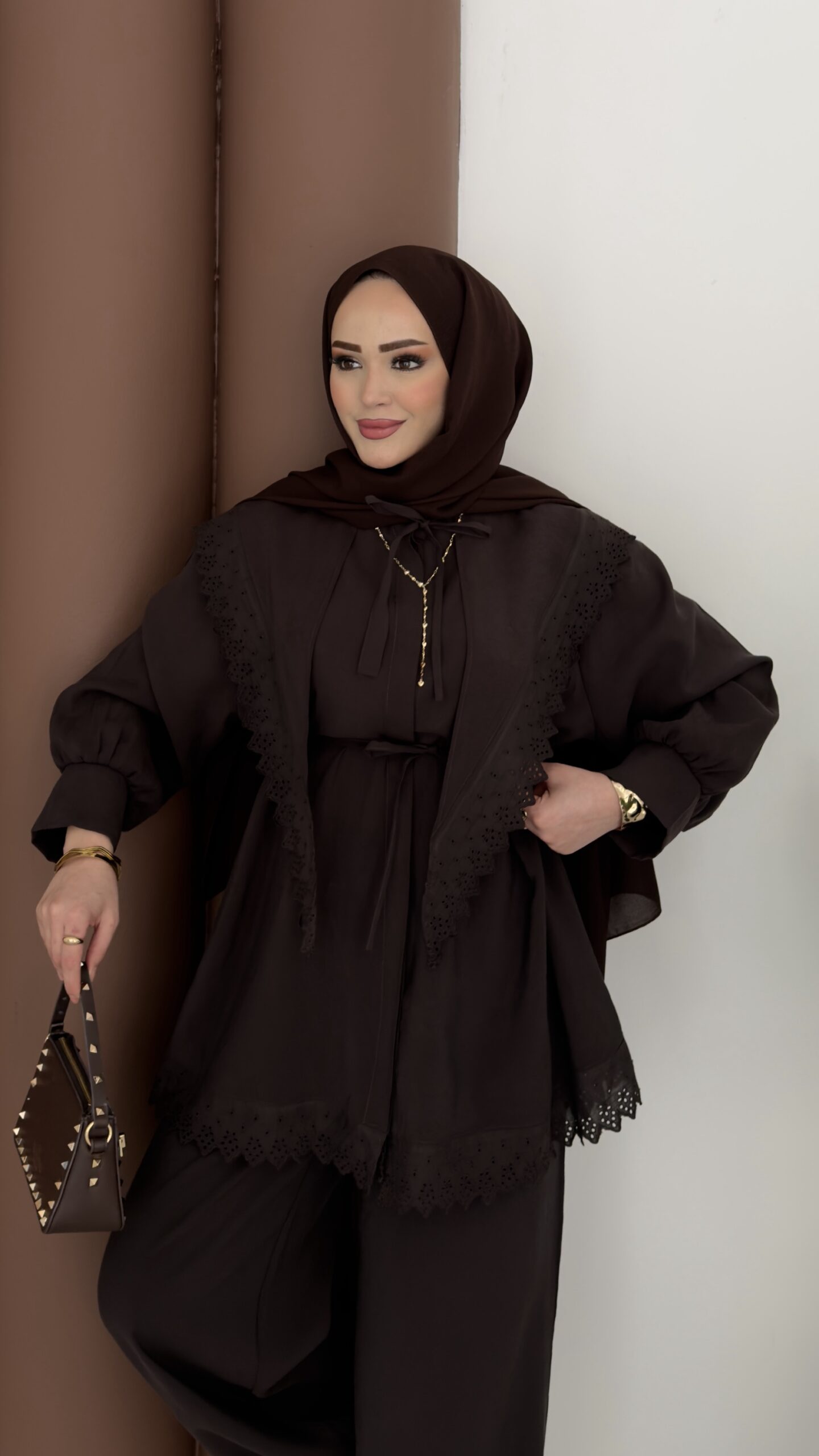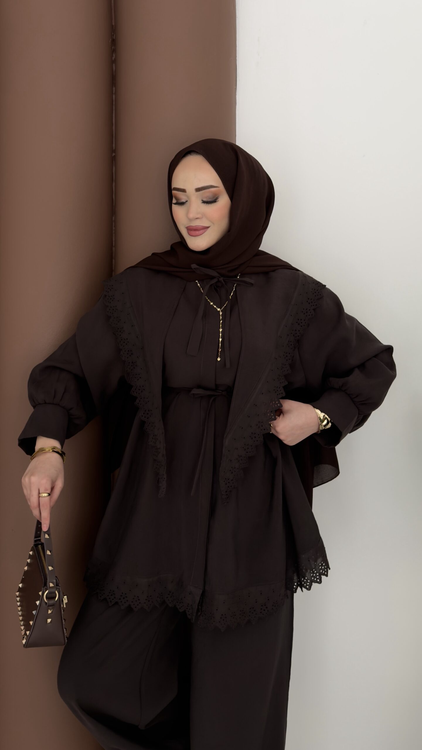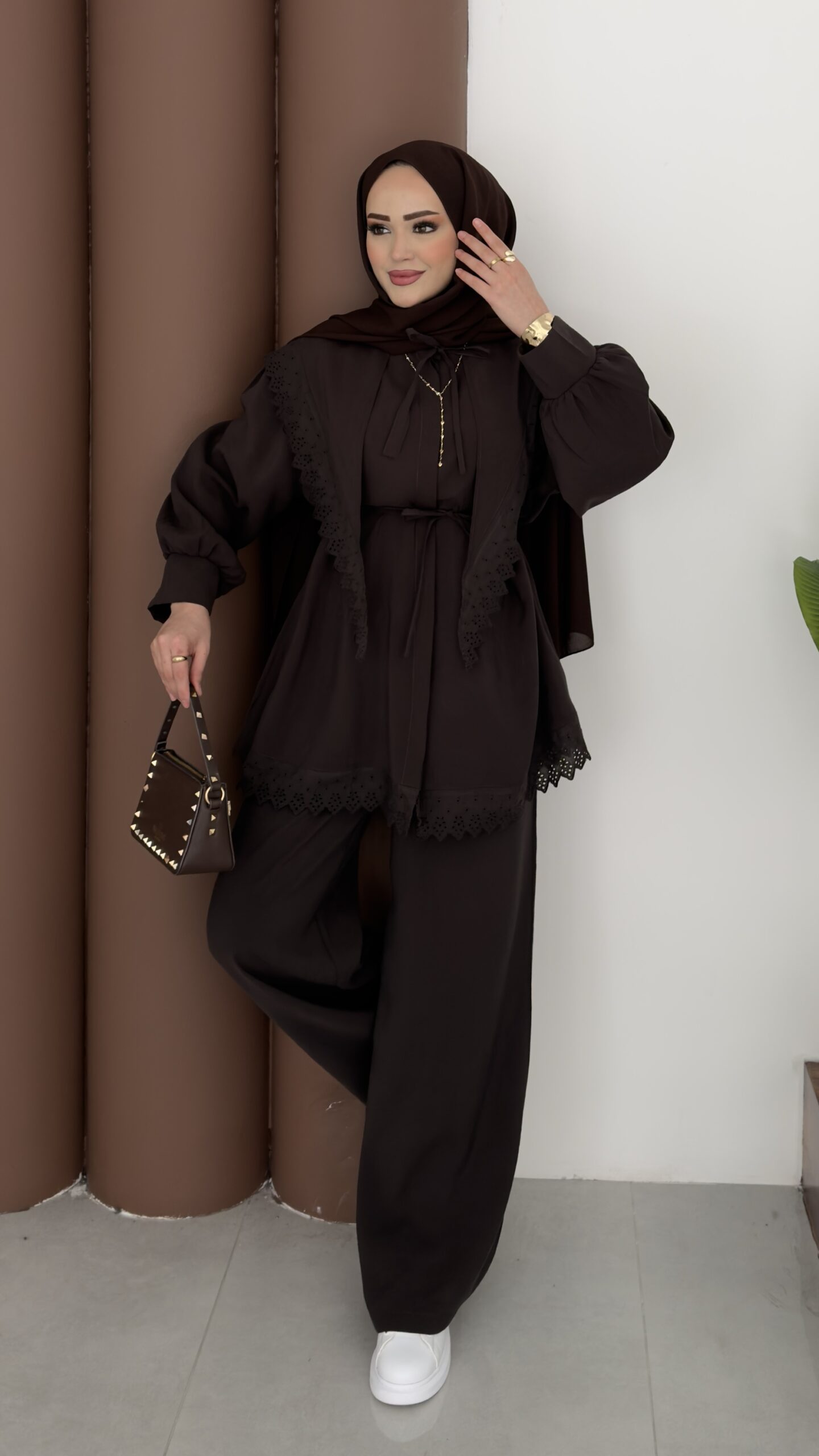 Güpür Yakalı Modal İkili Takım – Kahverengi