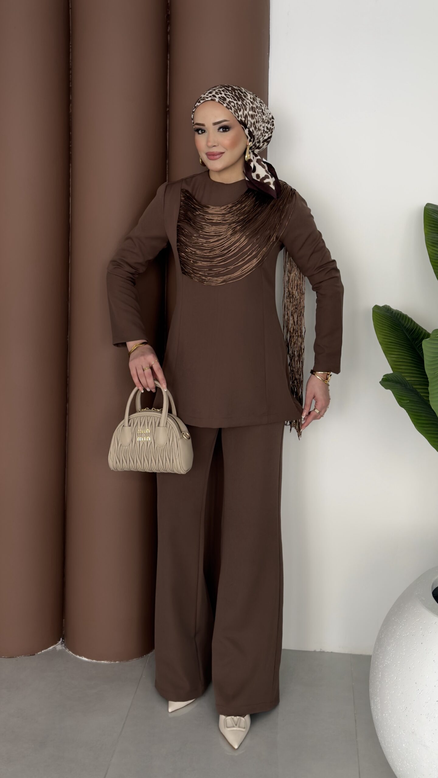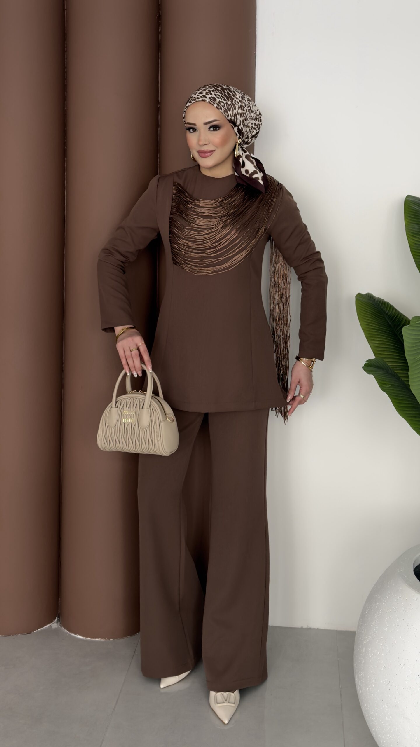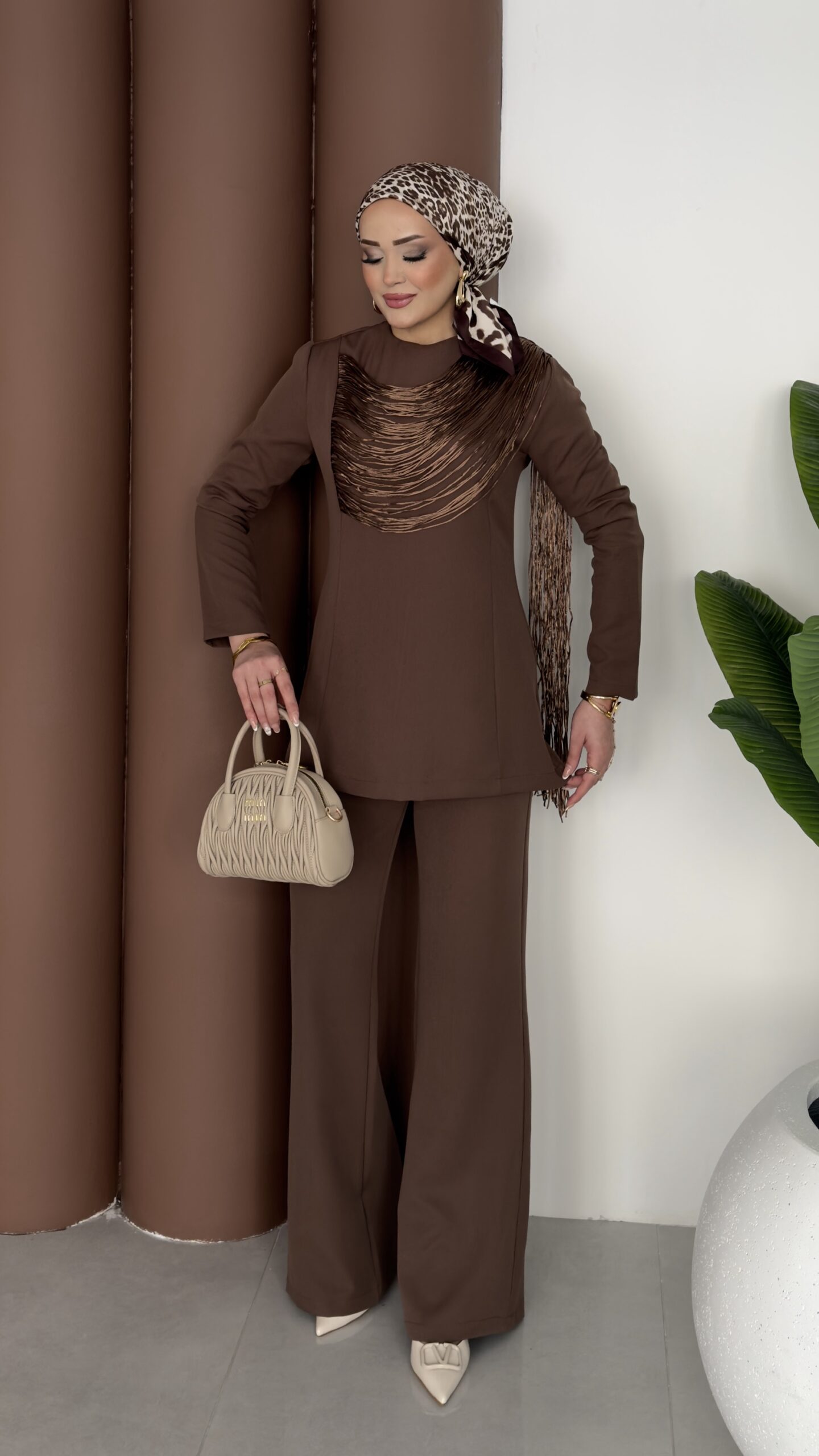 Kuğu Omuzu Püskül İpli İkili Takım – Kahverengi