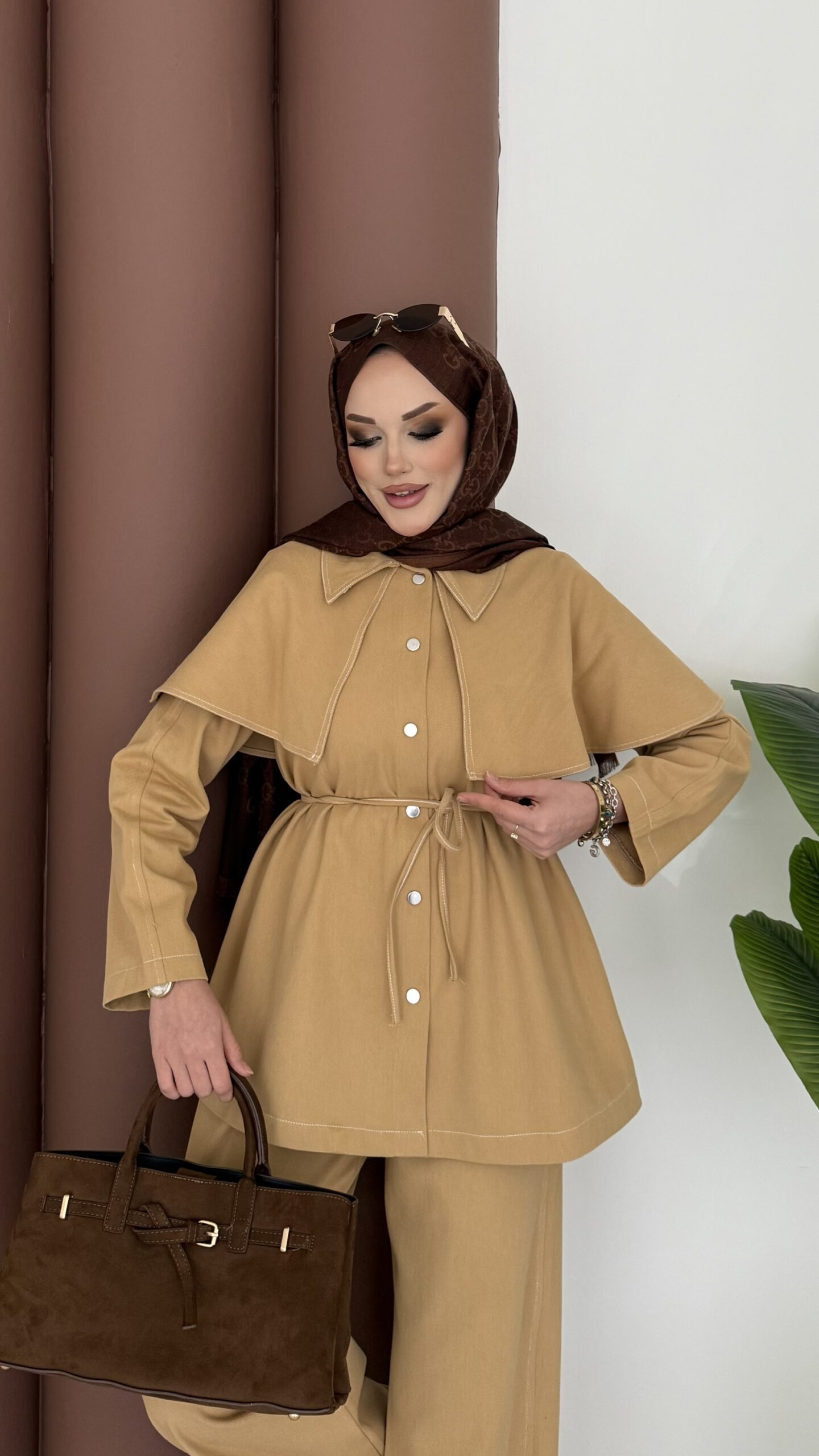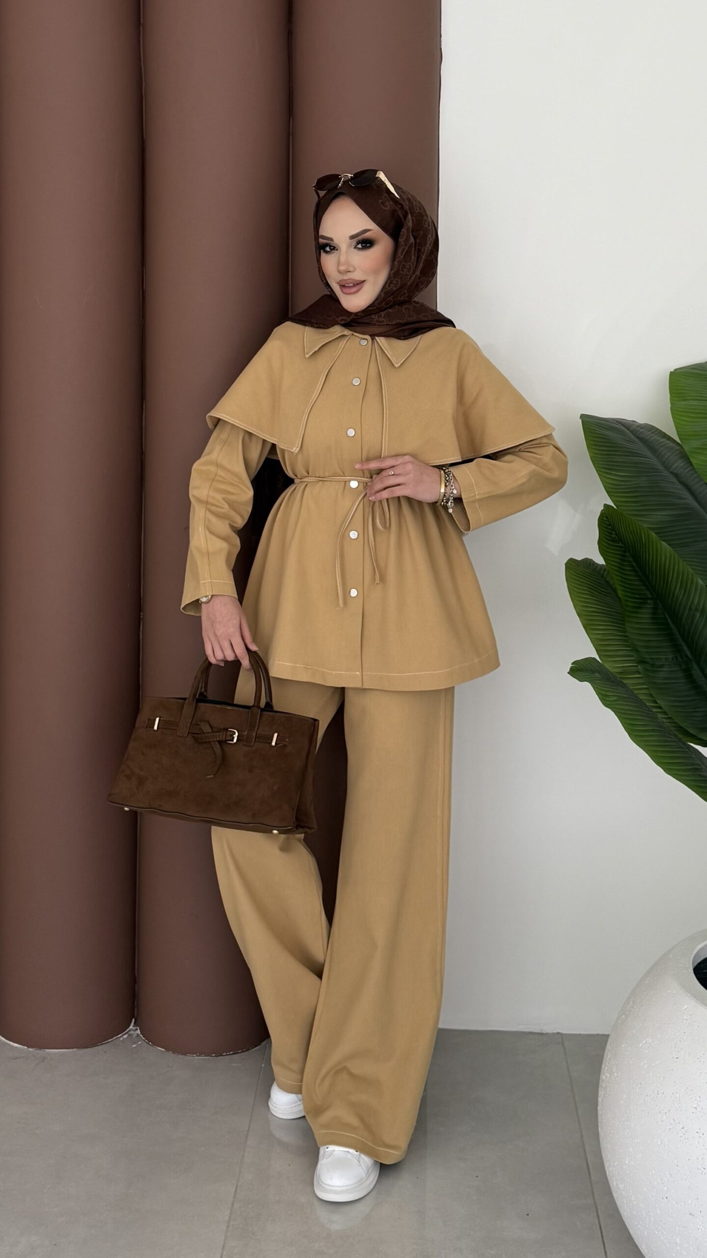Pelerin Detaylı Gabardin İkili Takım – Hardal