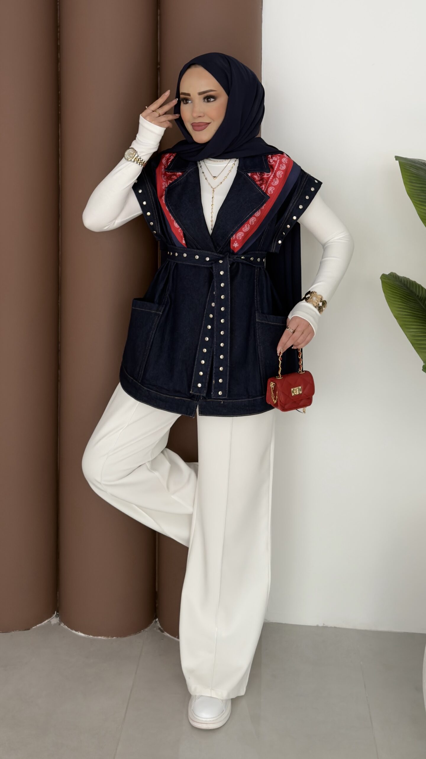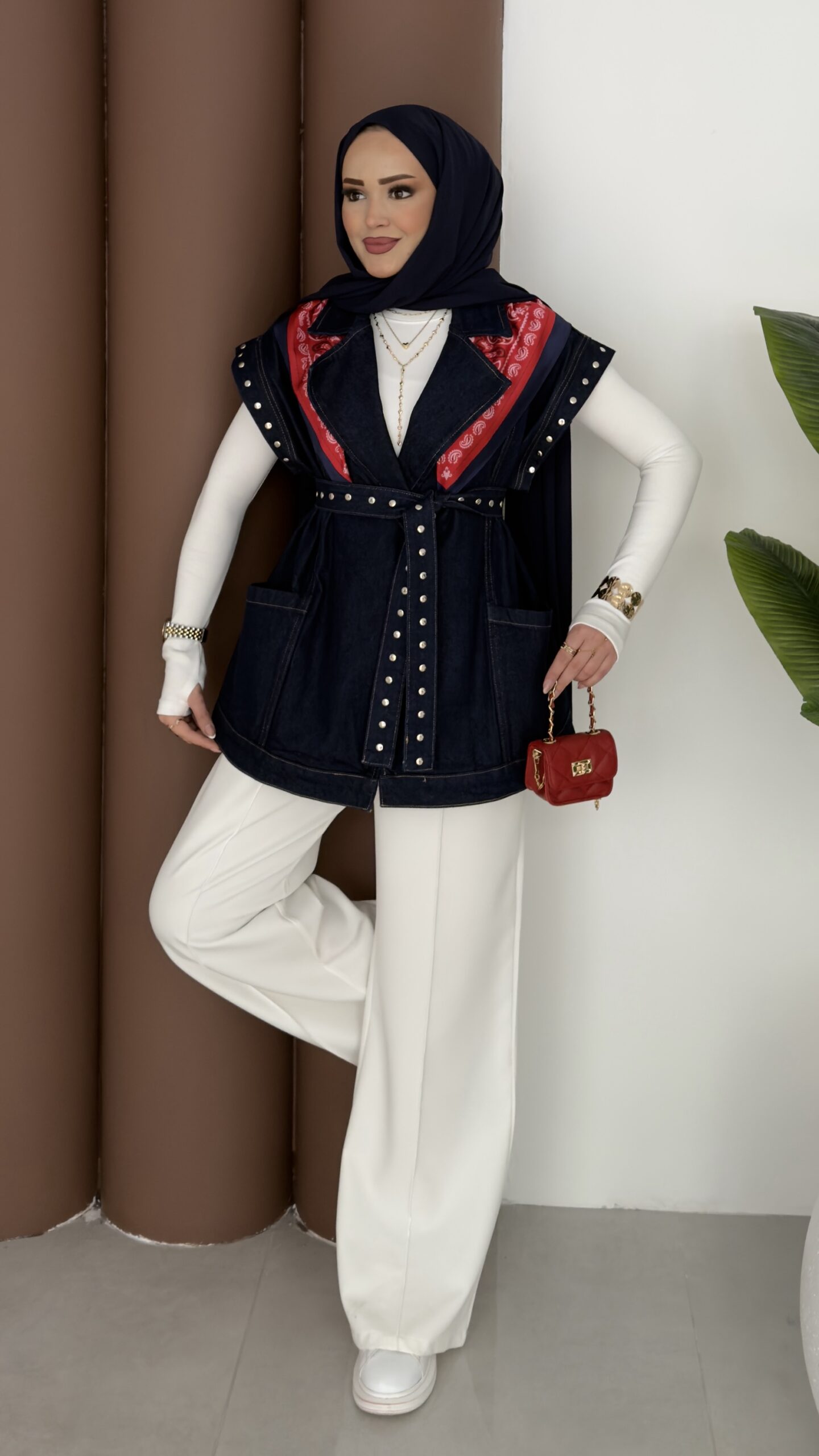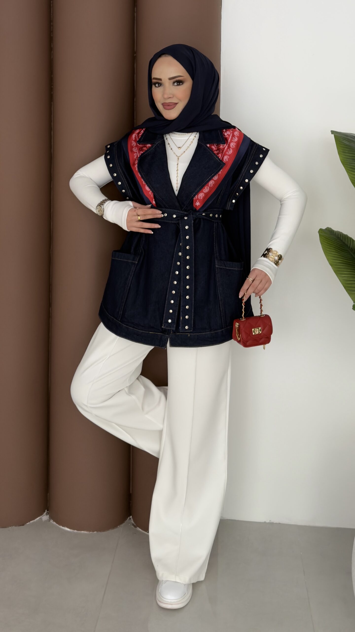 Premium Zımbalı Tasarım Kot Yelek – Koyu Mavi