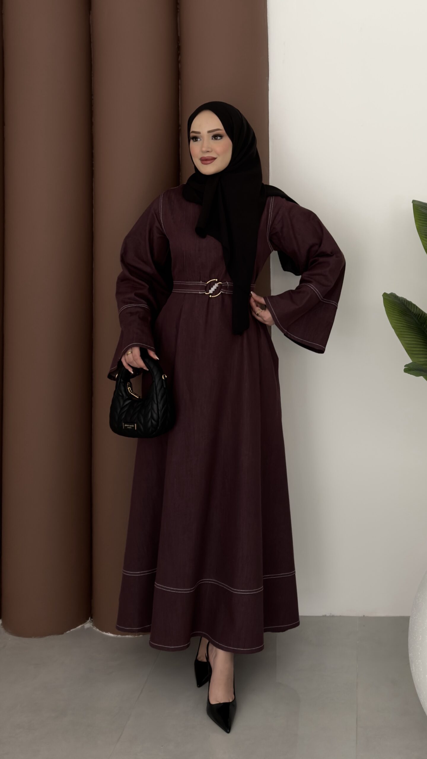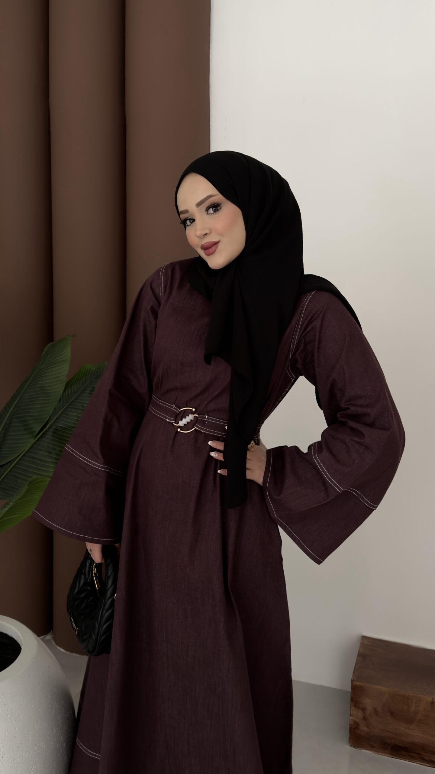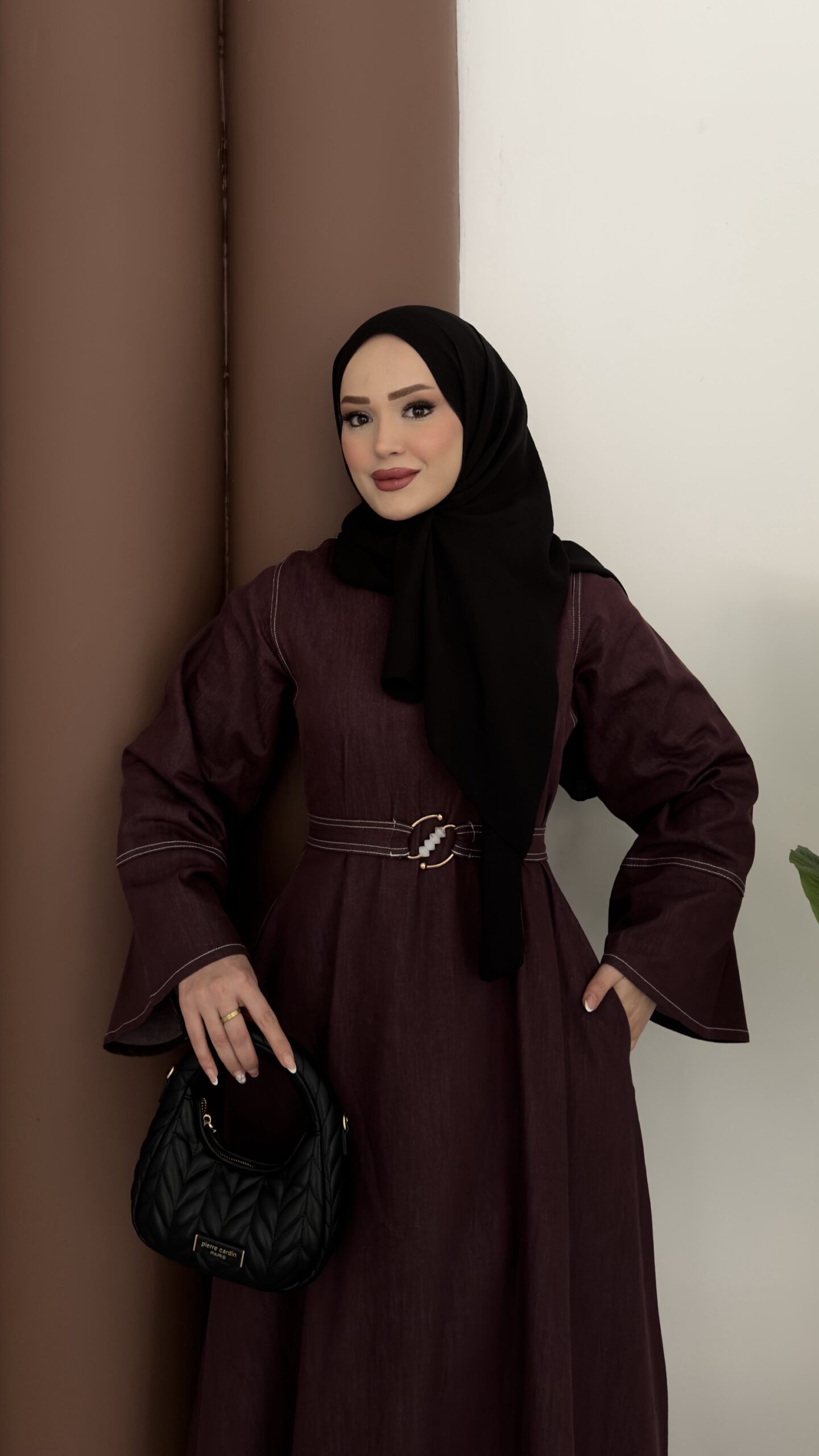 Rose Boncuk Kemerli Kot Elbise – Bordo