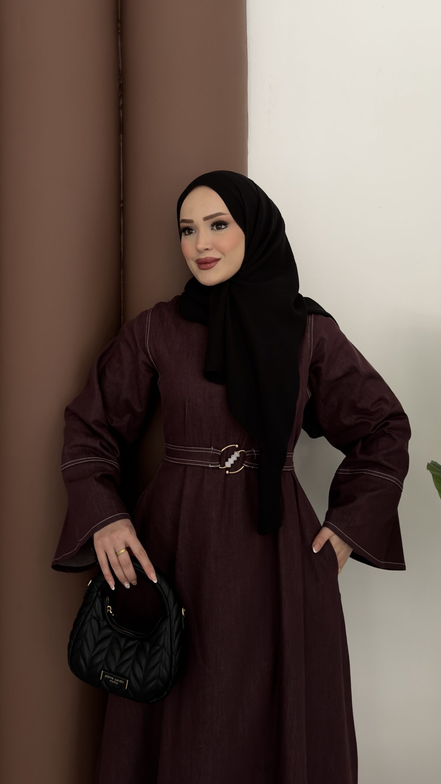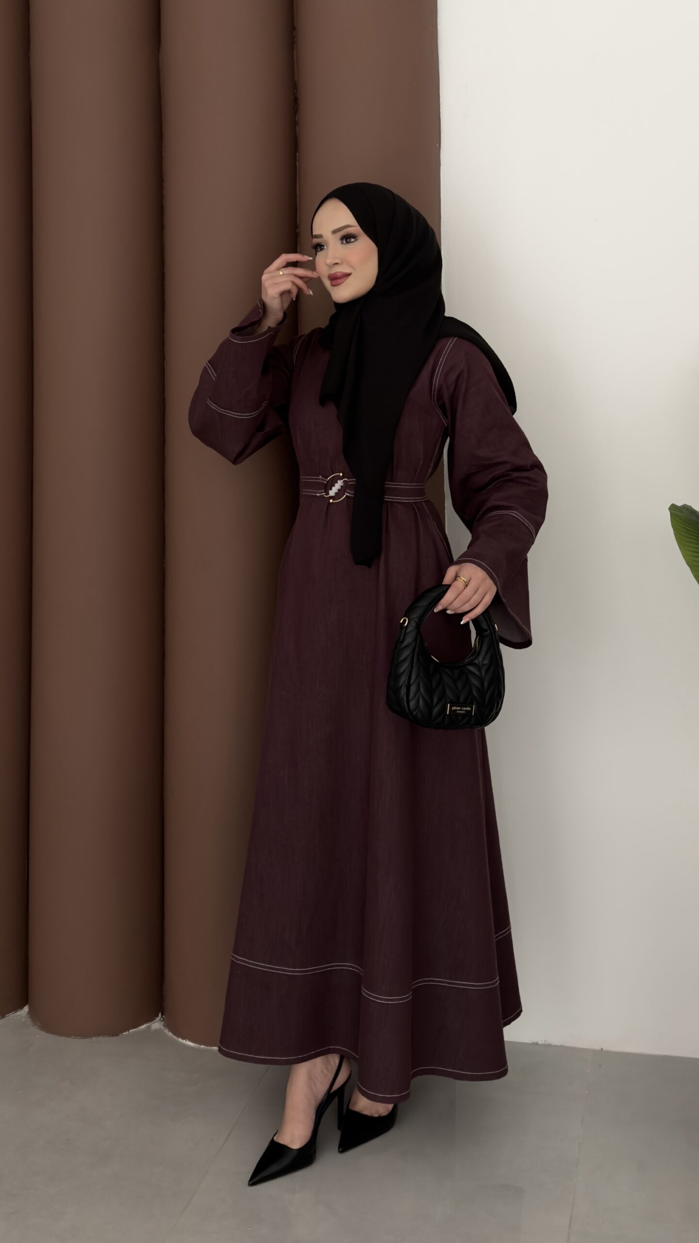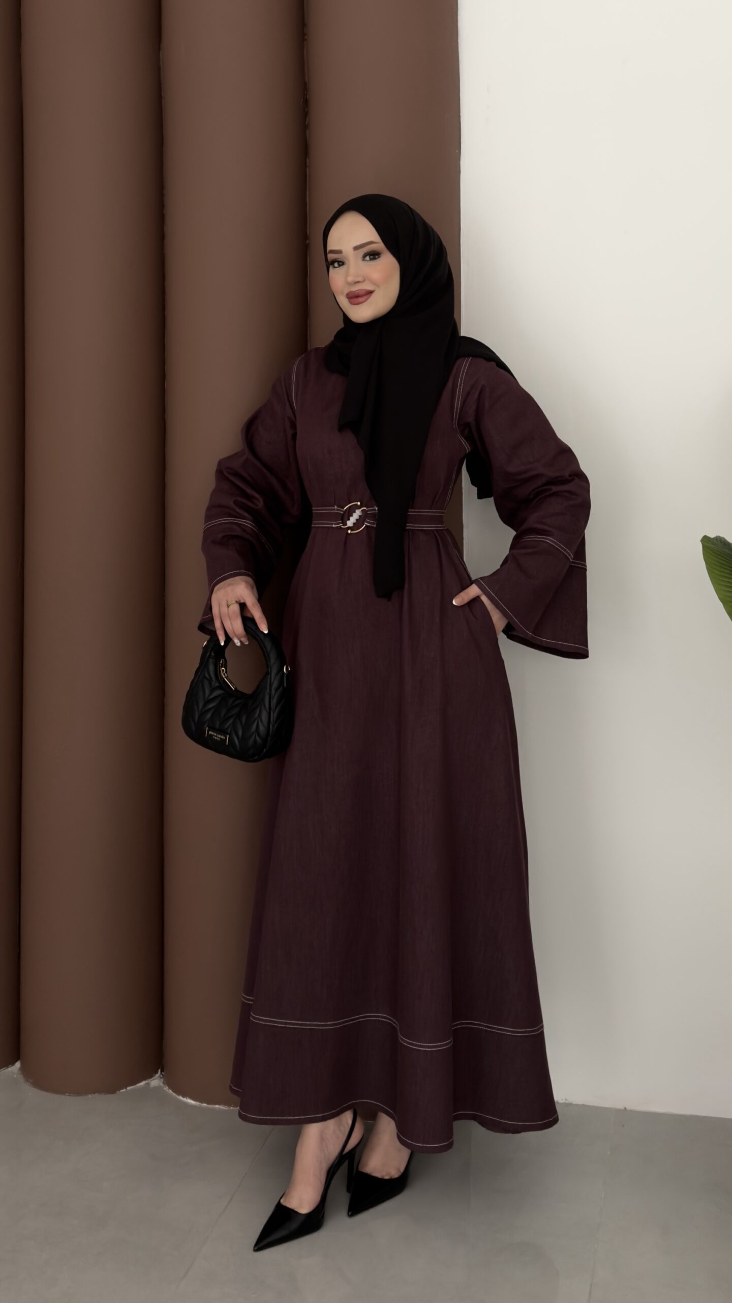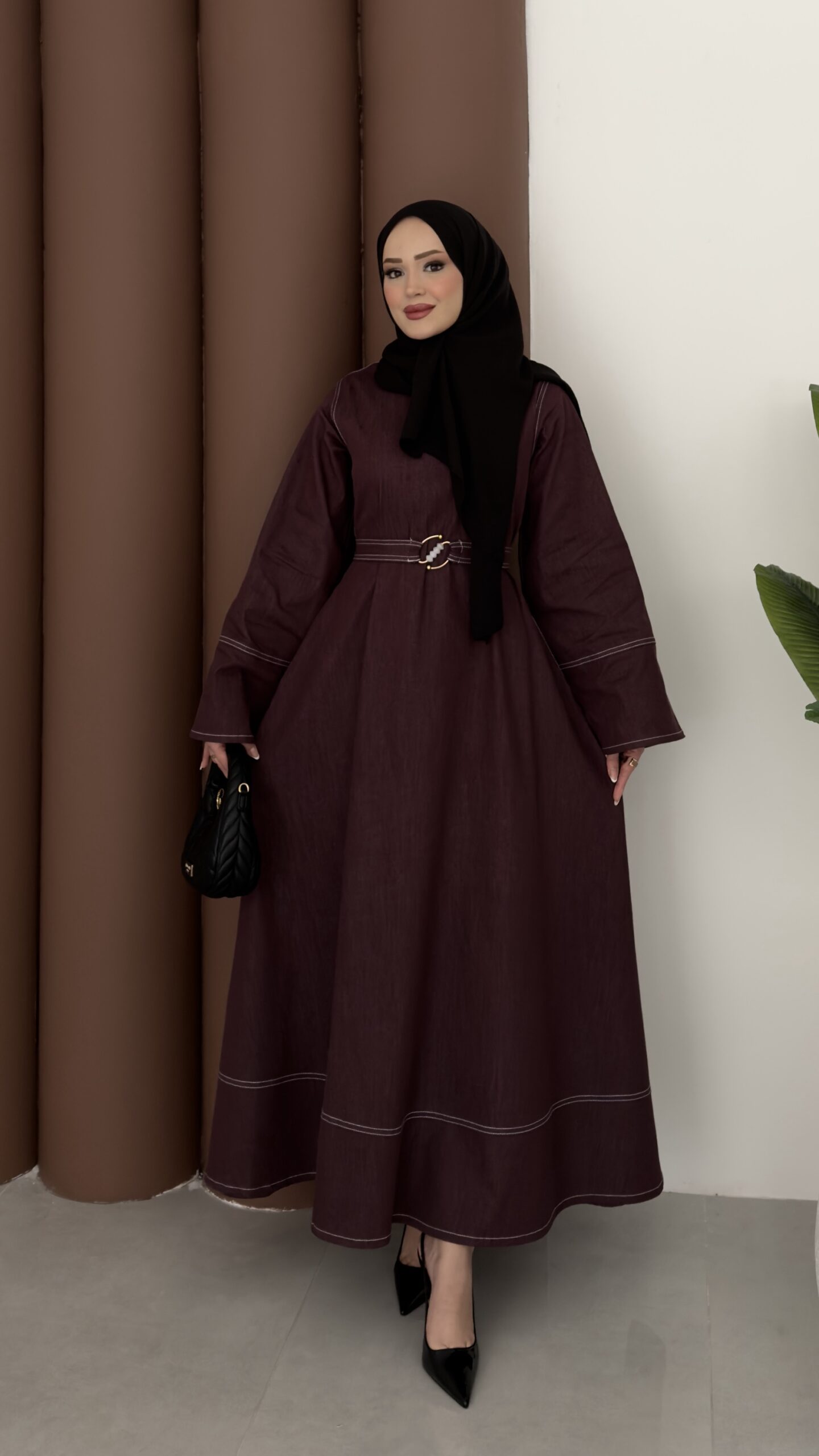 Rose Boncuk Kemerli Kot Elbise – Bordo
